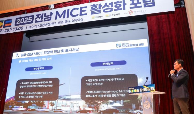 Àü³² MICE »ê¾÷ÀÇ »õ·Î¿î µµ¾àÀ» ¸ð»öÇÏ´Â À̹ø Æ÷·³¿¡¼ ±èµµ¿¬ ±³¼ö´Â ¡°±¤ÁÖ¿Í Àü³²ÀÌ °æÀïÀÌ ¾Æ´Ñ '»óÈ£ º¸¿Ï' °ü°è°¡ µÇ¾î¾ß ÇÑ´Ù¡±¸é¼ ¡ã±¤ÁÖ´Â ±è´ëÁßÄÁº¥¼Ç¼¾Å͸¦ Áß½ÉÀ¸·Î ÇÑ ºñÁî´Ï½º¡¤ÀÎÇÁ¶ó Çãºê·Î ¡ãÀü³²Àº õÇýÀÇ ÀÚ¿¬È¯°æ°ú À¯´ÏÅ© º£´º(¹«¾ÈȲÅä°¹¹ú·£µå µî 23°³¼Ò)¸¦ ¾Õ¼¼¿î ÄÜÅÙÃ÷¡¤À£´Ï½º Çãºê·Î ƯÈ, ÈÞ¾ç°ú ºñÁî´Ï½º°¡ À¯±âÀûÀ¸·Î °áÇÕµÈ '±¤¿ª À¶ÇÕÇü MICE ¸ðµ¨'À» ¿Ï¼ºÇÏÀÚ°í °Á¶Çß´Ù.