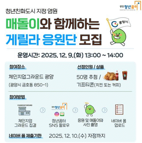 [ÅåÅå´º½º]±¤¾ç½Ã´Â û³âģȵµ½Ã ÁöÁ¤¿¡ ´ëÇÑ ½Ã¹Î °ø°¨´ë¸¦ È®»êÇϰí û³â Âü¿© ºÐÀ§±â¸¦ Á¶¼ºÇϱâ À§ÇØ ¿À´Â 12¿ù 9ÀÏ ¿ÀÈÄ 1½ÃºÎÅÍ 2½Ã±îÁö üÀÎÁö¾÷±×¶ó¿îµå ±¤¾ç ÀÏ´ë¿¡¼ ¡®¸Åµ¹ÀÌ¿Í ÇÔ²²Çϴ û³âģȵµ½Ã ÁöÁ¤ ¿°¿ø °Ô¸±¶ó ÀÀ¿ø´Ü¡¯À» ¿î¿µÇÑ´Ù°í 5ÀÏ ¹àÇû´Ù.