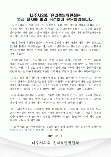 [ÅåÅå´º½º]³ªÁÖ½ÃÀÇȸ À±¸®Æ¯º°À§¿øÈ¸(À§¿øÀå ±èÁ¤¼÷)´Â 12¿ù 8ÀÏ, È«¡Û¡Û ÀÇ¿ø ¡°èÀÇ °Ç °ü·ÃÇÑ ½É»ç ÀýÂ÷°¡ ÁøÇàµÇ´Â °¡¿îµ¥ À§¿ø ±¸¼º, ±âÇÇ ½Åû, ÀϺΠÀ§¿ø »çÀÓ µîÀ¸·Î ³í¶õÀÌ À̾îÁø »óȲ°ú °ü·ÃÇØ ÀÔÀå¹®À» ¹ßÇ¥ÇÏ°í ¡°¹ý°ú ÀýÂ÷¿¡ µû¶ó °øÁ¤ÇÏ°Ô ÆÇ´ÜÇϰڴ١±°í ¹àÇû´Ù.