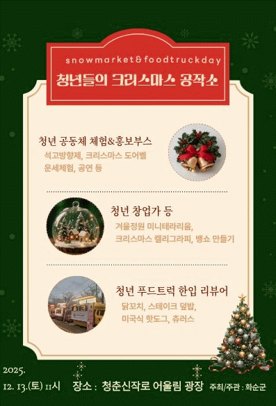 ¶ÇÇÑ, û³â À½¾Ç°¡ÀÇ °ø¿¬°ú ¹ð¼î ¸¸µé±â, Å©¸®½º¸¶½ºÆ®¸® ¼Ò¿øÄ«µå ´Þ±â¸¦ ÁøÇàÇÏ¿© ´Ù¾çÇÑ ÄÜÅÙÃ÷¸¦ ¼±»çÇÒ °èȹÀÌ´Ù.