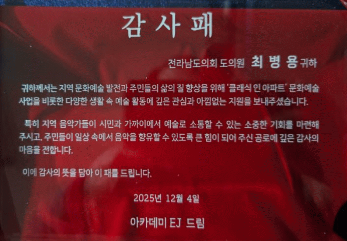 [ÅåÅå´º½º]Àü¶ó³²µµÀÇȸ ÃÖº´¿ë ÀÇ¿ø(¿©¼ö5, ´õºÒ¾î¹ÎÁÖ´ç)ÀÌ Áö¿ª ¹®È¿¹¼ú ¹ßÀü°ú ÁֹΠ»îÀÇ Áú Çâ»ó¿¡ ±â¿©ÇÑ °ø·Î¸¦ ÀÎÁ¤¹Þ¾Æ Áö³ 4ÀÏ Áö¿ª ¿¹¼ú±³À° ±â°üÀÎ ¡®¾ÆÄ«µ¥¹Ì EJ(´ëÇ¥ ÀÌÀºÁÖ)¡¯·ÎºÎÅÍ °¨»çÆÐ¸¦ ¼ö»óÇß´Ù.