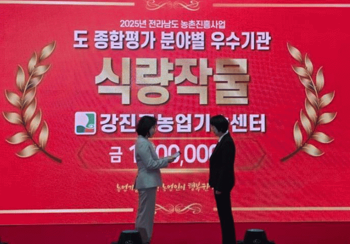 [ÅåÅå´º½º]°Áø±º ³ó¾÷±â¼ú¼¾ÅͰ¡ Áö³ 11ÀÏ Àü¶ó³²µµ°¡ ÁÖ°üÇÑ 2025³â ³óÃÌÁøÈï»ç¾÷ Á¾ÇÕÆò°¡¿¡¼ ¡®½Ä·®ÀÛ¹° ±â¼úº¸±Þ ºÐ¾ß¡¯ ¿ì¼ö±â°üÀ¸·Î ¼±Á¤µÇ´Â ¿µ¿¹¸¦ ¾È¾Ò´Ù.