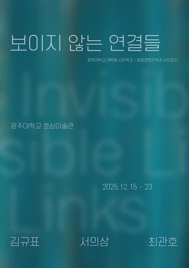 [ÅåÅå´º½º]±¤ÁÖ´ëÇб³(ÃÑÀå ±èµ¿Áø) ´ëÇпø¿¡ ÀçÇÐ ÁßÀÎ 3ÀÎÀÇ ÀÛ°¡°¡ Âü¿©ÇÏ´Â »çÁøÀü <º¸ÀÌÁö ¾Ê´Â ¿¬°áµé Invisible Links>°¡ 15ÀϺÎÅÍ 23ÀϱîÁö ±³³» È£½É¹Ì¼ú°ü¿¡¼ ¿¸°´Ù. À̹ø Àü½Ã´Â »çÁøÇаú ±è±ÔÇ¥, ¼ÀÇ»ó, ¹®ÈÄÜÅÙÃ÷Çаú ÃÖ°üÈ£ ¾¾°¡ °¢ÀÚÀÇ ½Ã¼±À¸·Î Æ÷ÂøÇÑ À̹ÌÁö¸¦ ÅëÇØ ½Ã°£°ú ±â¾ï, °ø°£°ú »çȸ¸¦ ÀÕ´Â ¡®º¸ÀÌÁö ¾Ê´Â ¿¬°á¡¯À» ޱ¸ÇÑ´Ù.