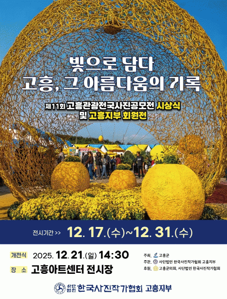 [ÅåÅå´º½º]°íÈﱺÀº ¿À´Â 12¿ù 17ÀϺÎÅÍ 31ÀϱîÁö °íÈï¾ÆÆ®¼¾ÅÍ¿¡¼ Á¦11ȸ °íÈï°ü±¤ Àü±¹ »çÁø°ø¸ðÀü Àü½Ãȸ¸¦ °³ÃÖÇÑ´Ù°í ¹àÇû´Ù.
