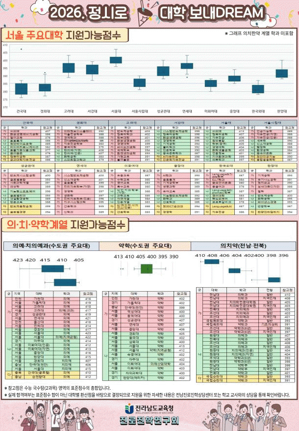 À̹ø ¹èġǥ¿¡´Â ¼öµµ±Ç°ú Àü¶ó±Ç ÀÇ¡¤Ä¡¡¤¾àÇаè¿, ¼¿ï ÁÖ¿ä ´ëÇÐ, Àü³²´ëÇÐÀÇ Áö¿ø °¡´É Á¡¼ö°¡ ÇÔ²² Á¦½ÃµÆ´Ù.