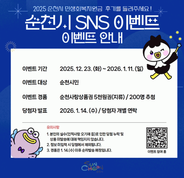 À̺¥Æ®´Â ¿À´Â 2026³â 1¿ù 11ÀϱîÁö ÁøÇàµÇ¸ç, ¼øÃµ½Ã¹Î ´©±¸³ª Âü¿©ÇÒ ¼ö ÀÖ´Ù.