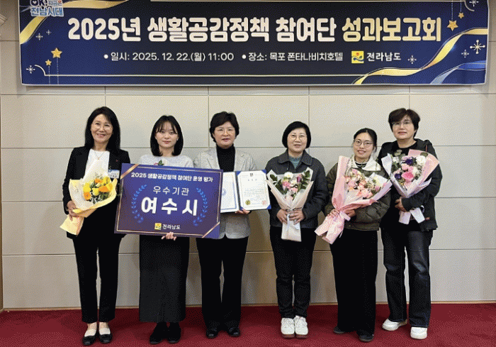 [ÅåÅå´º½º]¿©¼ö½Ã°¡ 2025³â »ýȰ°ø°¨Á¤Ã¥ Âü¿©´Ü Æò°¡¿¡¼ Àü³²µµ ½Ã¡¤±º °¡¿îµ¥ 1À§¸¦ Â÷ÁöÇØ µµÁö»ç ±â°ü ǥâÀ» ¼ö»óÇß´Ù.