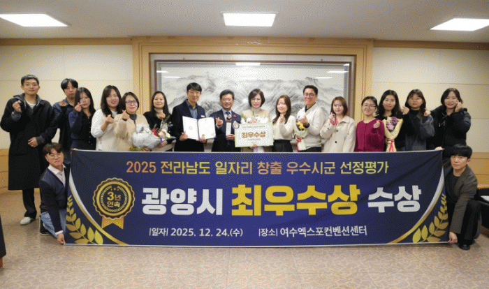 [ÅåÅå´º½º]±¤¾ç½Ã°¡ 24ÀÏ ¿ÀÈÄ 2½Ã ¿©¼ö¿¢½ºÆ÷ÄÁº¥¼Ç¼¾ÅÍ¿¡¼ ¿¸° ¡®Àü¶ó³²µµ ÀÏÀÚ¸®¡¤°æÁ¦ ÇѸ¶´ç¡¯ Çà»ç¿¡¼ ¡®2025³â Àü¶ó³²µµ ÀÏÀÚ¸® âÃâ ¿ì¼ö ½Ã±º Æò°¡¡¯ ÃÖ¿ì¼ö»óÀ» ¼ö»óÇß´Ù.