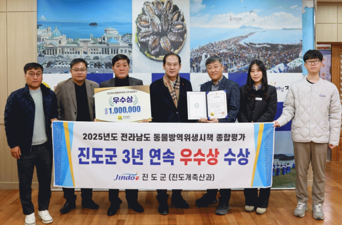 [ÅåÅå´º½º]Áøµµ±ºÀº Àü¶ó³²µµ¿¡¼ ÁÖ°üÇÑ ¡®2025³â µ¿¹°¹æ¿ªÀ§»ý½ÃÃ¥ Á¾ÇÕÆò°¡¡¯¿¡¼ ¿ì¼ö»óÀ» ¹ÞÀ¸¸ç, 3³â ¿¬¼Ó ¿ì¼ö Áö¹æÀÚÄ¡´Üü·Î ¼±Á¤µÆ´Ù.