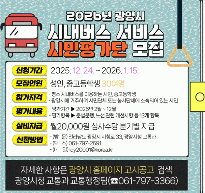 ½Ã¹ÎÆò°¡´ÜÀº ¼ºÀΰú Áß¡¤°íµîÇлý 30¸í ³»¿Ü·Î ±¸¼ºµÇ¸ç, 2026³â 2¿ùºÎÅÍ 12¿ù±îÁö °ü³» ¿î¼ö¾÷üÀÎ ±¤¾ç±³ÅëÀÌ ¿î¿µÇÏ´Â 30°³ ³ë¼±À» ´ë»óÀ¸·Î Á÷Á¢ ½Ã³»¹ö½º¸¦ ÀÌ¿ëÇÏ¸ç Æò°¡ Ȱµ¿À» ¼öÇàÇÏ°Ô µÈ´Ù.