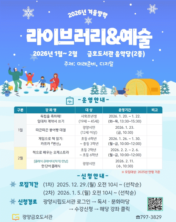 [ÅåÅå´º½º]±¤¾ç±ÝÈ£µµ¼°üÀÌ 2026³â °Ü¿ï¹æÇÐ ÇÁ·Î±×·¥ ¡®¶óÀ̺귯¸®¡¤¿¹¼ú¡¯ ¼ö°»ýÀ» ¸ðÁýÇÑ´Ù.