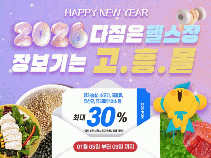 [ÅåÅå´º½º]°íÈﱺÀÌ ¿î¿µÇÏ´Â ¿Â¶óÀÎ ³ó¼öÃàÆ¯»ê¹° ¼îÇθô °íÈï¸ôÀÌ »õÇØ ´ÙÁü ½ÃÁðÀ» ¸Â¾Æ 2026³â 1¿ù 5ÀϺÎÅÍ 9ÀϱîÁö 5Àϰ£, ÃÖ´ë 30% ÇÒÀÎ ÇýÅÃÀ» Á¦°øÇϴ Ưº° ±âȹÀü ¡®´ÙÁüÀº ÇコÀå, À庸±â´Â °íÈï¸ô¡¯À» ÁøÇàÇÑ´Ù.