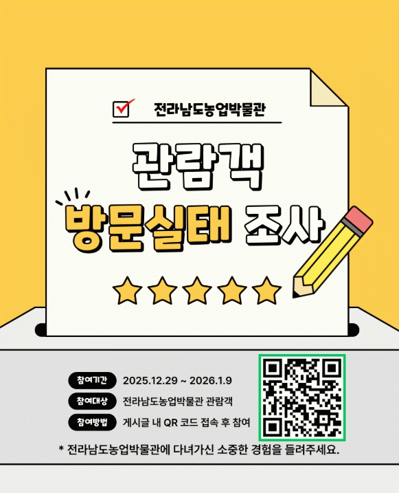 [ÅåÅå´º½º]Àü¶ó³²µµ³ó¾÷¹Ú¹°°üÀÌ °ü¶÷°´ÀÇ ÀÌ¿ë ½ÇŸ¦ ÆÄ¾ÇÇϰí, ³ó¾÷¹Ú¹°°ü ¾î¸°ÀÌ º¹ÇÕ¹®È°ü °Ç¸³¿¡ ´ëÇÑ µµ¹Î ÀνÄÀ» ¼ö·ÅÇϱâ À§ÇØ 9ÀϱîÁö ÃÑ 2Á¾ÀÇ ¼³¹®Á¶»ç¸¦ ½Ç½ÃÇÑ´Ù.