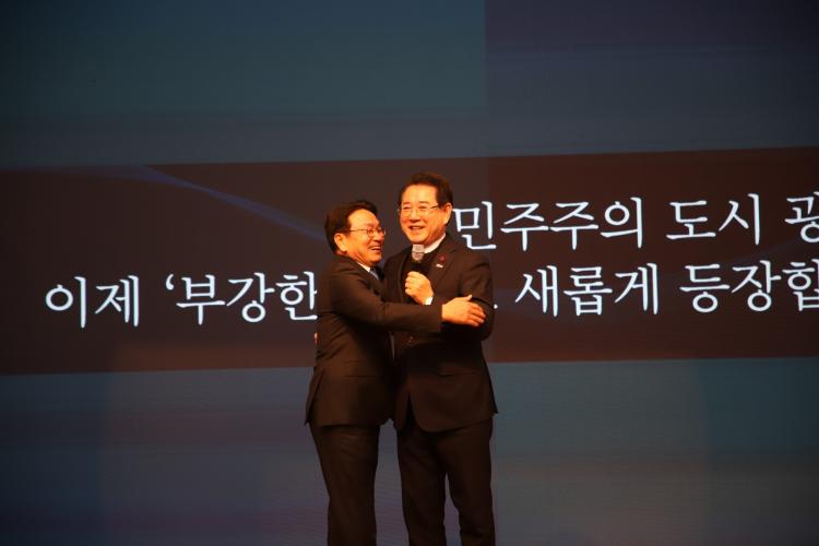 [ÅåÅå´º½º] °±âÁ¤ ±¤ÁÖ±¤¿ª½ÃÀåÀÌ 11ÀÏ ±è´ëÁßÄÁº¥¼Ç¼¾ÅÍ¿¡¼ ¿¸° '±¤ÁÖ, óÀ½º¸´Ù ´õ ±ØÀûÀÎ µÎ ¹øÂ° µîÀå' ÃâÆÇ±â³äȸ¿¡¼ ±è¿µ·Ï Àü³²Áö»ç¿Í Æ÷¿ËÇϰí ÀÖ´Ù.