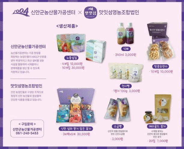 ¸ÀÀÕ¼¶¿µ³óÁ¶ÇÕ¹ýÀÎÀº ³ó»ê¹°°¡°ø¼¾Å͸¦ °ÅÁ¡À¸·Î ½Å¾È±ºÀÇ ¿ì¼ö ³ó¼öƯ»ê¹°À» Ȱ¿ëÇÑ ´©·î¼¶Ä¨, ÆÛÇýÄÇý, ½Å¾È¶¥Äá°Á¤, ²ÉÂ÷, ½Å¾È¼Ò±Ý»§ µî 7°³ À¯Çü 32ǰ¸ñÀÇ °¡°ø½ÄǰÀ» Á¦Á¶¡¤ÆÇ¸ÅÇϰí ÀÖÀ¸¸ç, ÇöÀç °¡°øÃ¢¾÷À» Èñ¸ÁÇÏ´Â Á¶ÇÕ¿ø 27¸íÀÌ È°¹ßÈ÷ Ȱµ¿ ÁßÀÌ´Ù.