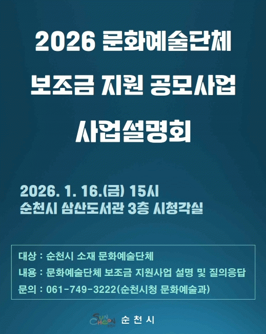 [ÅåÅå´º½º]¼øÃµ½Ã´Â ¿À´Â 16ÀÏ ¿ÀÈÄ 3½Ã, »ï»êµµ¼°ü 3Ãþ ½Ãû°¢½Ç¿¡¼ ¼øÃµ½Ã ¹®È¿¹¼ú´Üü¸¦ ´ë»óÀ¸·Î ¡®2026³â ¼øÃµ½Ã ¹®È¿¹¼ú´Üü º¸Á¶±Ý Áö¿ø»ç¾÷ ¼³¸íȸ¡¯¸¦ °³ÃÖÇÑ´Ù°í ¹àÇû´Ù.