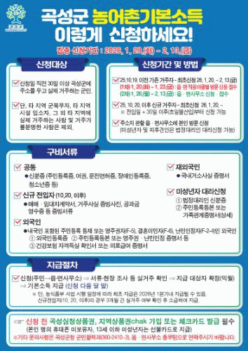 [ÅåÅå´º½º]Àü³² °î¼º±ºÀº 2026³âºÎÅÍ 2027³â±îÁö 2³â°£ ÃßÁøÇϴ¡®³ó¾îÃÌ ±âº»¼Òµæ ½Ã¹ü»ç¾÷¡¯°ú °ü·ÃÇØ, ÁֹΠÀÌÇØ¸¦ µ½±â À§ÇØ Áö³ 8ÀϺÎÅÍ ÃßÁøÇß´ø À¾¡¤¸é ¼øÈ¸ Áֹμ³¸íȸ¸¦ ¿À´Â 16ÀϱîÁö ¸ðµÎ ¸¶Ä¡°í, 1¿ù 20ÀϺÎÅÍ 2¿ù 13ÀϱîÁö ÁýÁß ½Åû ±â°£À» ¿î¿µÇÑ´Ù°í 13ÀÏ ¹àÇû´Ù.