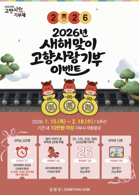 ¸ÕÀú, »õÇØ ±âºÎ Âü¿© ºÐÀ§±â Á¶¼ºÀ» À§ÇØ À̺¥Æ® ±â°£ ³» ¼±Âø¼ø ±âºÎÀÚ 200¸í¿¡°Ô ³×À̹öÆäÀÌ Æ÷ÀÎÆ® 5õ ¿ø±ÇÀ» ÁõÁ¤ÇÑ´Ù. ¶ÇÇÑ 2026³â ºÓÀº ¸»ÀÇ ÇØ¸¦ ±â³äÇØ ¸»¶ì ±âºÎÀÚ Áß 26¸íÀ» ¹«ÀÛÀ§·Î Ãß÷ÇÏ¿© ³×À̹öÆäÀÌ Æ÷ÀÎÆ® 1¸¸ ¿ø±ÇÀ» Áö±ÞÇÔÀ¸·Î½á ±âºÎ Âü¿©ÀÇ Áñ°Å¿òÀ» ´õÇÒ °èȹÀÌ´Ù.