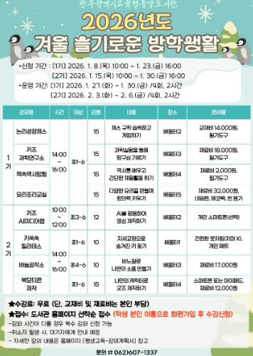 [ÅåÅå´º½º]±¤Áֽñ³À°Ã»Áß¾Óµµ¼°üÀº °Ü¿ï¹æÇÐÀ» ¸Â¾Æ ¿À´Â 27ÀϺÎÅÍ 2¿ù 6ÀϱîÁö ÃʵîÇлýÀ» ´ë»óÀ¸·Î ¡®°Ü¿ï ½½±â·Î¿î ¹æÇлýȰ¡¯À» ¿î¿µÇÑ´Ù.