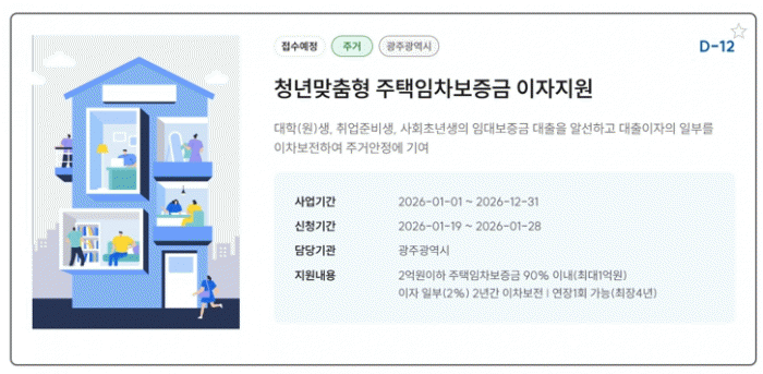 [ÅåÅå´º½º]±¤ÁÖ±¤¿ª½Ã´Â ¹«ÁÖÅà û³âÀÇ Áְźñ ºÎ´ã ¿Ïȸ¦ À§ÇÑ Ã»³â¸ÂÃãÇü ÁÖÅÃÀÓÂ÷º¸Áõ±Ý ÀÌÀÚÁö¿ø »ç¾÷ ´ë»óÀÚ¸¦ 19ÀϺÎÅÍ ¸ðÁýÇÑ´Ù.