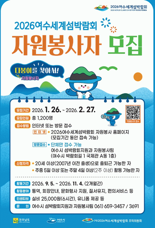 [ÅåÅå´º½º]¿©¼ö½Ã´Â 2026¿©¼ö¼¼°è¼¶¹Ú¶÷ȸ¸¦ ÇÔ²² À̲ø¾î°¥ ÀÚ¿øºÀ»çÀÚ ¡°´ÙºÀÀÌ¡± 1,200¿© ¸íÀ» ¿À´Â 1¿ù 26ÀϺÎÅÍ 2¿ù 27ÀϱîÁö ÇÑ ´Þ°£ ¸ðÁýÇÒ ¿¹Á¤ÀÌ´Ù.