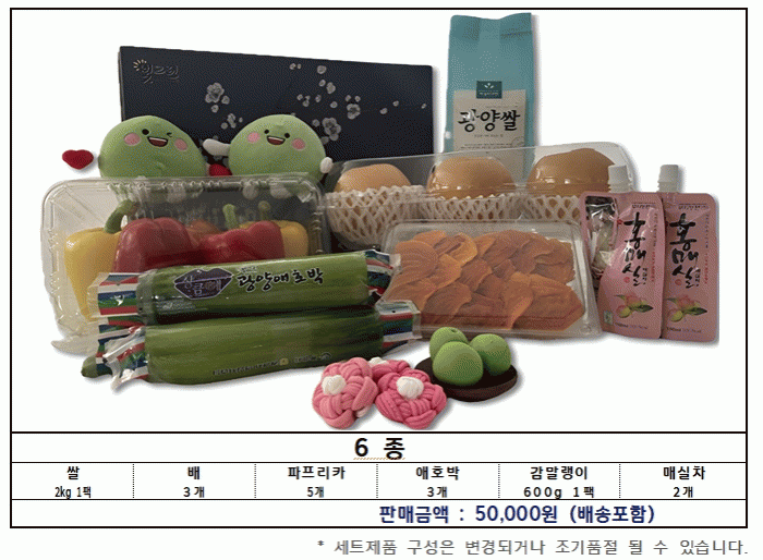 À̹ø ¼±¹°¼¼Æ®´Â ±¤¾ç¿¡¼ »ý»êµÈ ¿ì¼ö ³óƯ»ê¹°·Î ¡ã½Ò ¡ã¹è ¡ãÆÄÇÁ¸®Ä« ¡ã¾ÖÈ£¹Ú ¡ã°¨¸»·©ÀÌ ¡ã¸Å½ÇÂ÷ µî 6°³ ǰ¸ñÀ¸·Î ±¸¼ºµÆÀ¸¸ç, ¹è¼Ûºñ¸¦ Æ÷ÇÔÇØ 5¸¸ ¿ø¿¡ ÆÇ¸ÅµÈ´Ù.