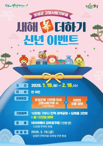 [ÅåÅå´º½º] º¸¼º±ºÀº 2026³â »õÇØ¸¦ ¸Â¾Æ °íÇâ»ç¶û±âºÎÁ¦ Âü¿©¸¦ È®´ëÇÏ°í ±âºÎ ¹®È¸¦ Ȱ¼ºÈÇϱâ À§ÇØ ¿À´Â 2¿ù 18ÀϱîÁö ¡®»õÇØ º¹ ´õÇϱ⠽ųâ À̺¥Æ®¡¯¸¦ ÃßÁøÇÑ´Ù°í ¹àÇû´Ù.