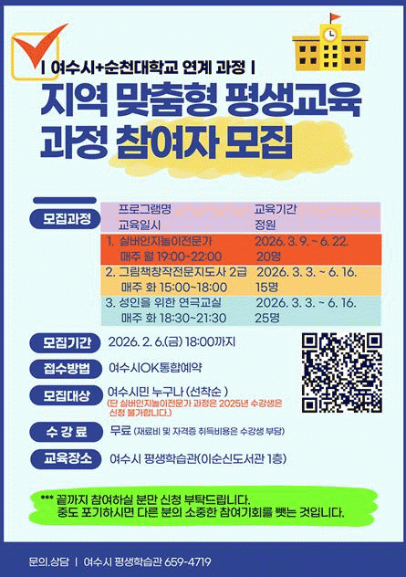 À̹ø »ç¾÷Àº ¿©¼ö½Ã¿Í ¼øÃµ´ëÇб³°¡ Çù·ÂÇÏ¿© Áö¿ª Ư¼º°ú ½Ã¹ÎÀÇ ÇнÀ ¼ö¿ä¸¦ ¹Ý¿µÇÑ ¸ÂÃãÇü Æò»ý±³À°À» ¿î¿µÇÔÀ¸·Î½á, ½Ã¹ÎÀÇ ÇнÀ¿ª·®À» ³ôÀ̰í Àü¹®¼ºÀ» °ÈÇϱâ À§ÇØ ¸¶·ÃµÆ´Ù.