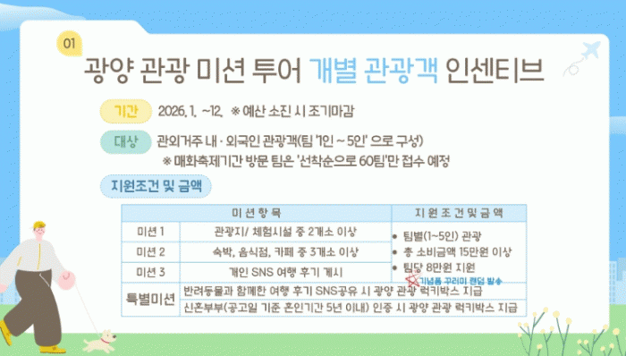 ÇØ´ç »ç¾÷Àº 1¿ù 26ÀϺÎÅÍ ¿î¿µµÇ¸ç, ¿¹»ê ¼ÒÁø ½Ã Á¶±â ¸¶°¨µÉ ¼ö ÀÖ°í ¿¬ 1ȸ¸¸ Áö¿øµÅ Áߺ¹ Âü¿©´Â ºÒ°¡ÇÏ´Ù. ƯÈ÷ ±¤¾ç¸ÅÈÃàÁ¦ ±â°£¿¡ ¹æ¹®ÇÏ´Â ÆÀÀº ¼±Âø¼ø 60ÆÀÀ¸·Î Á¦ÇÑÇØ Á¢¼öÇÒ ¿¹Á¤ÀÌ´Ù.
