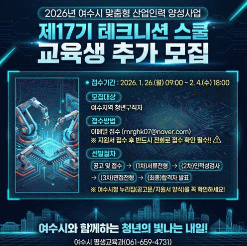 [ÅåÅå´º½º]¿©¼ö½Ã°¡ Áö¿ª »ê¾÷ ¼ö¿ä¿¡ ¸Â´Â Àü¹® ÀηÂÀ» ¾ç¼ºÇϱâ À§ÇØ ÃßÁøÇÏ´Â ¡®2026³â ¿©¼ö½Ã ¸ÂÃãÇü »ê¾÷Àη ¾ç¼º»ç¾÷¡¯ÀÇ ÀÏȯÀÎ 'Å×Å©´Ï¼Ç ½ºÄð Á¦17±â' ±³À°»ýÀ» Ãß°¡ ¸ðÁýÇÑ´Ù°í ¹àÇû´Ù.