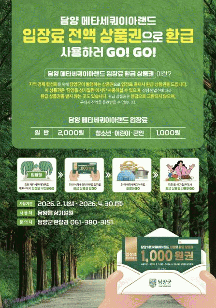[ÅåÅå´º½º]´ã¾ç±ºÀÌ ¿À´Â 2¿ù 1ÀϺÎÅÍ ´ëÇ¥ °ü±¤ÁöÀÎ ¸ÞŸ¼¼ÄõÀÌ¾Æ °¡·Î¼ö±æÀ» ã´Â °ü±¤°´À» ´ë»óÀ¸·Î ÀÔÀå·á Àü¾×À» ´ã¾ç»ç¶û»óǰ±ÇÀ¸·Î ȯ±ÞÇÏ´Â ¡®»ó»ý ÆäÀ̹顯 Á¦µµ¸¦ ½ÃÇàÇÑ´Ù.
