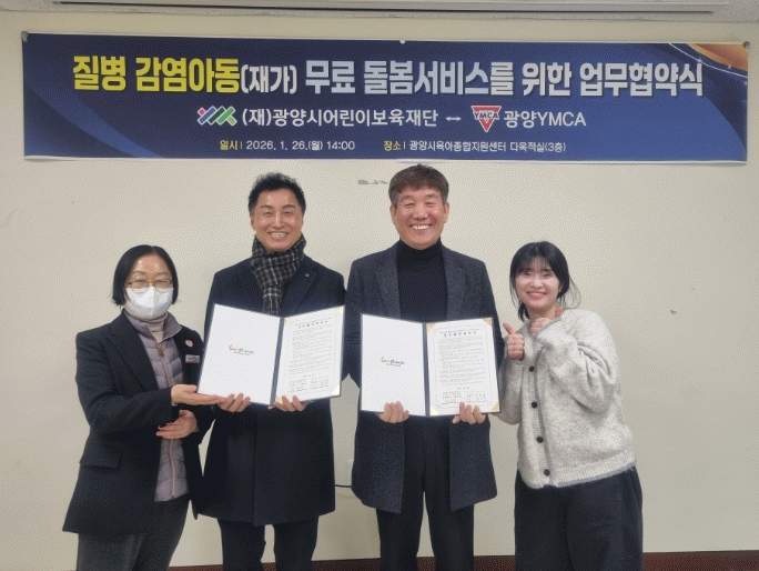 [ÅåÅå´º½º](Àç)±¤¾ç½Ã¾î¸°À̺¸À°Àç´ÜÀº 1¿ù 26ÀÏ ±¤¾ç½ÃÀ°¾ÆÁ¾ÇÕÁö¿ø¼¾ÅÍ ´Ù¸ñÀû½Ç¿¡¼ ±¤¾çYMCA¿Í 'Áúº´ °¨¿°¾Æµ¿(Àç°¡) ¹«·áµ¹º½ ¼ºñ½º Áö¿ø»ç¾÷' ÃßÁøÀ» À§ÇÑ ¾÷¹«Çù¾àÀ» ü°áÇß´Ù°í ¹àÇû´Ù.