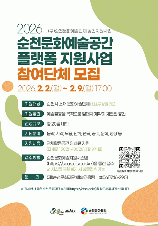 [ÅåÅå´º½º](Àç)¼øÃµ¹®ÈÀç´ÜÀº ¿À´Â 2¿ù 2ÀϺÎÅÍ 9ÀϱîÁö Áö¿ª ¹®È¿¹¼ú´ÜüÀÇ ¾ÈÁ¤ÀûÀΠȰµ¿ ±â¹ÝÀ» ¸¶·ÃÇϰí, ¹®È¿¹¼ú °ø°£À» Áö¿ª ¹®È¿¹¼ú »ýŰèÀÇ °ÅÁ¡À¸·Î À°¼ºÇϱâ À§ÇØ ¡®2026 ¼øÃµ¹®È¿¹¼ú°ø°£ Ç÷§Æû Áö¿ø»ç¾÷¡¯¿¡ Âü¿©ÇÒ ¹®È¿¹¼ú´Üü¸¦ ¸ðÁýÇÑ´Ù.
