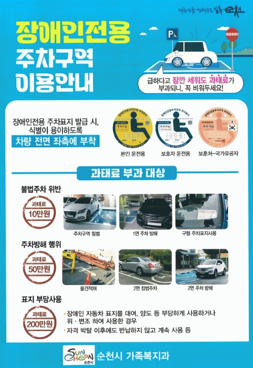 [ÅåÅå´º½º]¼øÃµ½Ã´Â Àå¾ÖÀÎÀÇ À̵¿±ÇÀ» º¸ÀåÇÏ°í ¿Ã¹Ù¸¥ ÁÖÂ÷ ¹®È¸¦ Á¤Âø½Ã۱â À§ÇØ Àå¾ÖÀÎÀü¿ëÁÖÂ÷±¸¿ª ÀÌ¿ë ¾È³» È«º¸ Ȱµ¿À» °ÈÇÑ´Ù°í ¹àÇû´Ù.