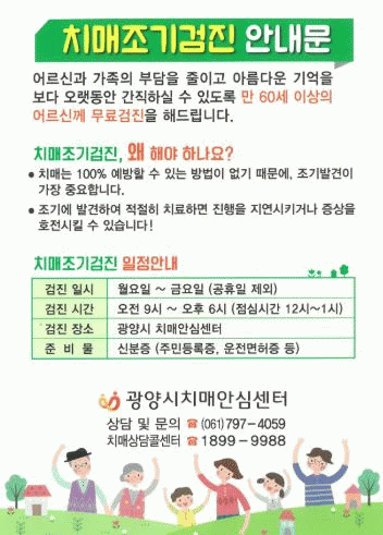 [ÅåÅå´º½º]±¤¾ç½ÃÄ¡¸Å¾È½É¼¾ÅÍ´Â Ä¡¸Å¸¦ Á¶±â¿¡ ¹ß°ßÇÏ°í ¿¹¹æÇϱâ À§ÇØ 60¼¼ ÀÌ»ó ½Ã¹ÎÀ» ´ë»óÀ¸·Î Ä¡¸Å Á¶±â°ËÁøÀ» ¿¬Áß ½Ç½ÃÇϰí ÀÖ´Ù.