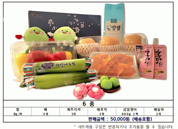 À̹ø ¼±¹°¼¼Æ®´Â ±¤¾ç³óÇù°ú Çù¾÷ÇØ ÃßÁøµÆÀ¸¸ç, ¡ã½Ò ¡ã¹è ¡ãÆÄÇÁ¸®Ä« ¡ã¾ÖÈ£¹Ú ¡ã°¨¸»·©ÀÌ ¡ã¸Å½Çû µî ±¤¾ç¿¡¼ »ý»êµÈ ¿ì¼ö ³óƯ»ê¹° 6°³ ǰ¸ñÀ¸·Î ±¸¼ºµÆ´Ù.
