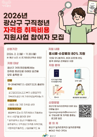 [ÅåÅå´º½º]±¤ÁÖ ±¤»ê±¸°¡ Ãë¾÷À» ÁغñÇϴ û³âÀÇ ÀÚ°ÝÁõ Ãëµæºñ¿ë Áö¿øÀ» ¿ÃÇØ ÃÖ´ë 20¸¸ ¿øÀ¸·Î È®´ëÇÑ´Ù.