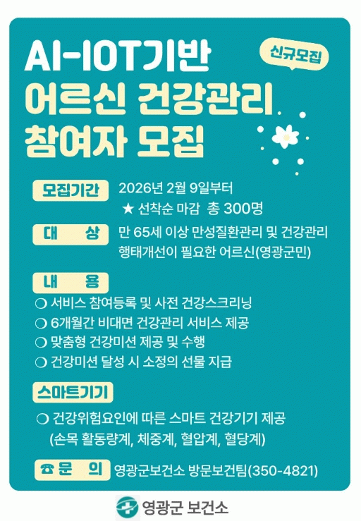 [ÅåÅå´º½º] ¿µ±¤±ºÀº Ãʰí·ÉÈ ½Ã´ë¿¡ ´ëºñÇØ 65¼¼ ÀÌ»ó ¿µ±¤±º¹ÎÀ» ´ë»óÀ¸·Î AI?IoT(ÀΰøÁö´É»ç¹°ÀÎÅͳÝ)±â¹Ý ¾î¸£½Å °Ç°°ü¸®»ç¾÷ ½Å±Ô Âü¿©ÀÚ 300¸íÀ» 2¿ù 9ÀϺÎÅÍ ¼±Âø¼ø ¸ðÁýÇÑ´Ù°í ¹àÇû´Ù.