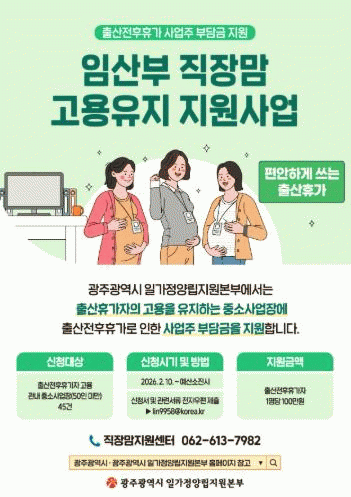 [ÅåÅå´º½º]±¤ÁÖ±¤¿ª½Ã Àϰ¡Á¤¾ç¸³Áö¿øº»ºÎ´Â ÀÓ»êºÎ ±Ù·ÎÀÚÀÇ Ãâ»ê ÀüÈÄ ÈÞ°¡ µî¿¡ µû¸¥ ºÎ´ã±ÝÀ» Áö¿øÇÏ´Â ¡®ÀÓ»êºÎ Á÷À帾 °í¿ëÀ¯Áö Áö¿ø»ç¾÷¡¯ ´ë»ó »ç¾÷ÀåÀ» ¿À´Â 10ÀϺÎÅÍ ¼±Âø¼ø ¸ðÁýÇÑ´Ù.
