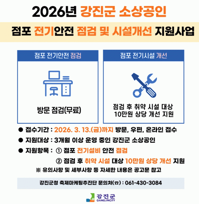 [ÅåÅå´º½º]°Áø±ºÀÌ ¼Ò»ó°øÀÎ »ç¾÷ÀåÀÇ Àü±â½Ã¼³À» Á¡°ËÇÏ°í °³¼±ÇÏ¿© ÈÀç µî Àç³ ¿¹¹æÀ» À§ÇØ ¾ÈÁ¤ÀûÀÎ Á¡Æ÷ ȯ°æÀ» Á¶¼ºÇÒ ¼ö ÀÖµµ·Ï Áö¿ø»ç¾÷À» ¸ðÁýÇÑ´Ù.
