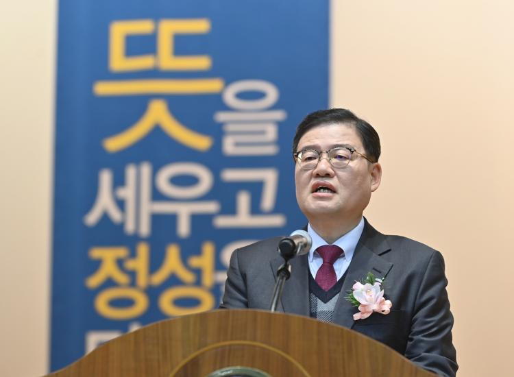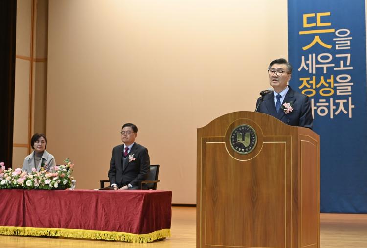 ¹Ú»óö ÃÑÀåµµ Ãà»ç¸¦ ÅëÇØ ¡°¿ì¸® ´ëÇÐÀÇ ¿ª»ç¿Í Çö½ÇÀ» ²ç¶Õ°í °è½Ã´Â ÀÌ»çÀå´ÔÀÇ ¸®´õ½Ê, dzºÎÇÑ °æÇè°ú ÅëÂûÀº Áö¿ª»çȸ ¹ßÀüÀ» ¼±µµÇÏ°í ½Ã´ë¸¦ ¾Õ¼°¡´Â Çõ½ÅÀÇ ÁÖ¿ªÀ¸·Î À̲ô´Â µçµçÇÑ ÀÌÁ¤Ç¥°¡ µÉ °Í¡±À̶ó¸é¼ ¡°ÀÌ»çÀå´ÔÀÇ ÃëÀÓÀ» ±¸½ÉÁ¡ »ï¾Æ ´ëÇÐ ±¸¼º¿øµé ¸ðµÎ°¡ ÁöÇý¸¦ ¸ðÀ¸°í ÇѸ¶À½ÀÌ µÅ¼ ¡®ÇлýÀÌ ÇູÇÑ ´ëÇС¯À» ¸¸µé¾î ³ª°¡´Âµ¥ ÈûÀ» ½ñ°Ú´Ù¡±´Â ÀÇÁö¸¦ ¹àÇû´Ù.