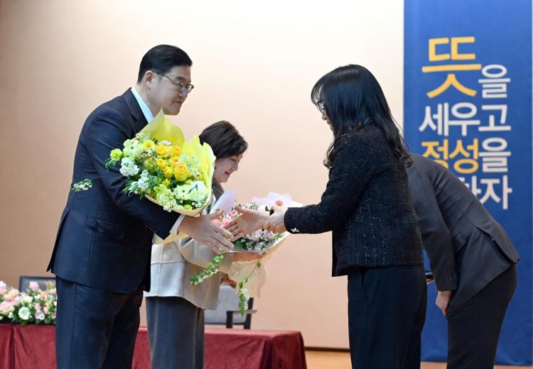 À̳¯ ÃëÀӽĿ¡´Â ±³Á÷¿ø°ú Ãѵ¿Ã¢È¸, ÃÑÇлýȸ ´ëÇ¥µéÀÌ ½ÅÀÓ ÀÌ»çÀåÀÇ ÃëÀÓ»ç ¸Þ½ÃÁö¸¦ µÇ³úÀ̸ç ÃàÇÏÀÇ ²É´Ù¹ßÀ» Àü´ÞÇÏ´Â ±â³ä ÆÛÆ÷¸Õ½º°¡ ÁøÇàµÅ ´«±æÀ» ²ø¾ú´Ù. ¶Ç ÃëÀÓ½Ä ÈÄ¿¡´Â Àüü ±³Á÷¿øµé°ú ½Å³âȸ¸¦ °âÇØ Àλ縦 ³ª´©´Â ½Ã°£ÀÌ ¸¶·ÃµÆ´Ù.