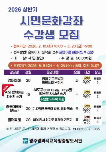 [ÅåÅå´º½º]±¤ÁÖ±¤¿ª½Ã±³À°Ã»Áß¾Óµµ¼°üÀº ¿À´Â 3¿ù 3ÀϺÎÅÍ 6¿ù 24ÀϱîÁö µµ¼°ü ¹è¿òÅÍ½Ç µî¿¡¼ ¡®2026³âµµ »ó¹Ý±â ½Ã¹Î¹®È°Á¡¯¸¦ ¿î¿µÇÑ´Ù.