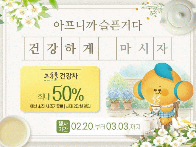 [ÅåÅå´º½º]°íÈﱺÀÌ ¿î¿µÇÏ´Â ¿Â¶óÀÎ ³ó¼öÃàÆ¯»ê¹° ¼îÇθô ¡®°íÈï¸ô¡¯Àº ȯÀý±â °Ç° °ü¸®¸¦ µ½±â À§ÇÑ ¡®°Ç°Â÷ ±âȹÀü¡¯À» ¿À´Â 2¿ù 20ÀϺÎÅÍ 3¿ù 3ÀϱîÁö ÁøÇàÇÑ´Ù°í ¹àÇû´Ù.