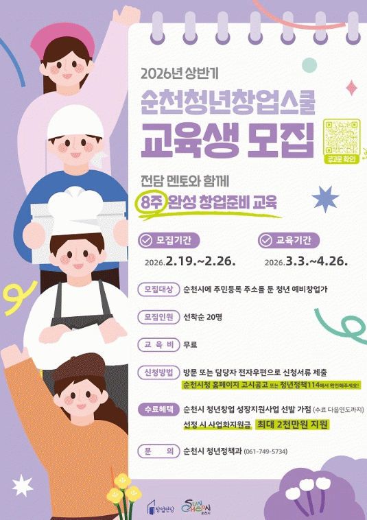 [ÅåÅå´º½º]¼øÃµ½Ã´Â â¾÷À» ÁغñÇÏ´Â Áö¿ª û³âµéÀÇ ¾ÆÀ̵ð¾î¸¦ ±¸Ã¼ÈÇϰí ü°èÀûÀÎ »ç¾÷ȸ¦ Áö¿øÇϱâ À§ÇØ '2026³â »ó¹Ý±â ¼øÃµÃ»³ââ¾÷½ºÄð' ±³À°»ýÀ» ¿À´Â 19ÀϺÎÅÍ 26ÀϱîÁö ¸ðÁýÇÑ´Ù°í ¹àÇû´Ù.