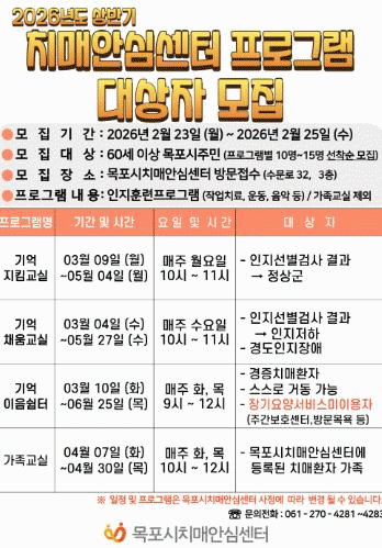 [ÅåÅå´º½º]¸ñÆ÷½Ã Çϴ纸°ÇÁö¼Ò Ä¡¸Å¾È½É¼¾ÅÍ´Â Áö¿ª ¾î¸£½ÅµéÀÇ Ä¡¸Å ¿¹¹æ°ú ÀÎÁö±â´É À¯Áö¸¦ À§ÇØ 2026³âµµ »ó¹Ý±â Ä¡¸Å¾È½É¼¾ÅÍ ÇÁ·Î±×·¥ ´ë»óÀÚ¸¦ ¸ðÁýÇÑ´Ù°í ¹àÇû´Ù.