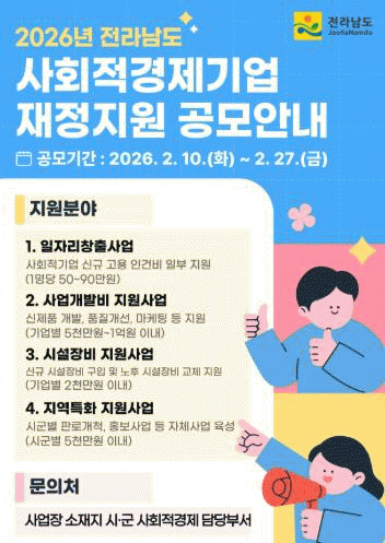 [ÅåÅå´º½º]Àü¶ó³²µµ´Â ¿À´Â 27ÀϱîÁö »çȸÀû°æÁ¦±â¾÷ÀÇ Áö¼ÓÀûÀÌ°í ¾ÈÁ¤ÀûÀÎ ¼ºÀå°ú ÀÚ¸³À» Áö¿øÇϱâ À§ÇÑ 2026³â »çȸÀû°æÁ¦±â¾÷ ÀçÁ¤Áö¿ø»ç¾÷ °ø¸ð¸¦ ÃßÁøÇÑ´Ù.
