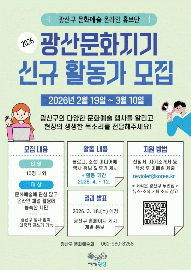 [ÅåÅå´º½º]±¤ÁÖ ±¤»ê±¸°¡ ±¤»ê±¸ ¹®È¿¹¼ú ¿Â¶óÀÎ È«º¸´Ü ¡®2026³â ±¤»ê¹®ÈÁö±â¡¯ Âü¿©ÀÚ¸¦ 3¿ù 10ÀϱîÁö ¸ðÁýÇÑ´Ù.