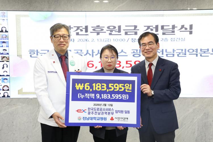 À̳¯ Àü´Þ½Ä¿¡´Â Á¤ ½Å ¿øÀå, ½ÉÁᫎ »ç¹«±¹Àå, ÁÖ¼ºÇÊ ±âȹÁ¶Á¤½ÇÀå, ÇÑÀ翵 ´ë¿ÜÇù·Â½ÇÀå, À±ÇöÁÖ °ø°øº¸°ÇÀÇ·á»ç¾÷½ÇÀå, ÃÖ¿ÁÀÚ °£È£ºÎÀå µî ÁÖ¿ä º¸Á÷ÀÚ¿Í Çѱ¹µµ·Î°ø»ç¼ºñ½º ±¤ÁÖÀü³²±Ç¿ªº»ºÎ ÀÓÁ÷¿øµéÀÌ Âü¼®Çß´Ù. Çѱ¹µµ·Î°ø»ç¼ºñ½º ±¤ÁÖÀü³²±Ç¿ªº»ºÎ´Â °æÁ¦Àû ¾î·Á¿òÀ¸·Î Ä¡·á¸¦ ¸Á¼³À̴ ȯÀÚµéÀ» À§ÇØ ÀÓÁ÷¿øµéÀÌ ½Ê½ÃÀÏ¹Ý ¸ðÀº ÈÄ¿ø±Ý 6,183,595¿øÀ» Àü´ÞÇß´Ù. À̷νá Çѱ¹µµ·Î°ø»ç¼ºñ½º ±¤ÁÖÀü³²±Ç¿ªº»ºÎ°¡ Àü³²´ëº´¿ø¿¡ ±âºÎÇÑ ´©Àû ÈÄ¿ø±ÝÀº ÃÑ 9,183,595¿ø¿¡ ´ÞÇÏ°Ô µÆ´Ù.