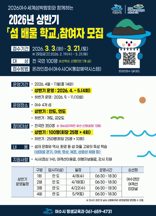 [ÅåÅå´º½º]¿©¼ö½Ã´Â 2026¿©¼ö¼¼°è¼¶¹Ú¶÷ȸÀÇ ¼º°øÀûÀÎ °³ÃÖ¸¦ À§ÇÑ ±¹¹ÎÀû °ü½ÉÀ» ³ôÀ̰í Áö¿ªÆ¯ÈÇü ¼¶ ´ä»ç ÇÁ·Î±×·¥À» ÅëÇØ À¯ÀÍÇÑ ÇнÀ°æÇèÀ» Á¦°øÇϰíÀÚ '2026³â »ó¹Ý±â ¼¶¹è¿ïÇб³' Âü¿©ÀÚ¸¦ ¸ðÁýÇÑ´Ù.